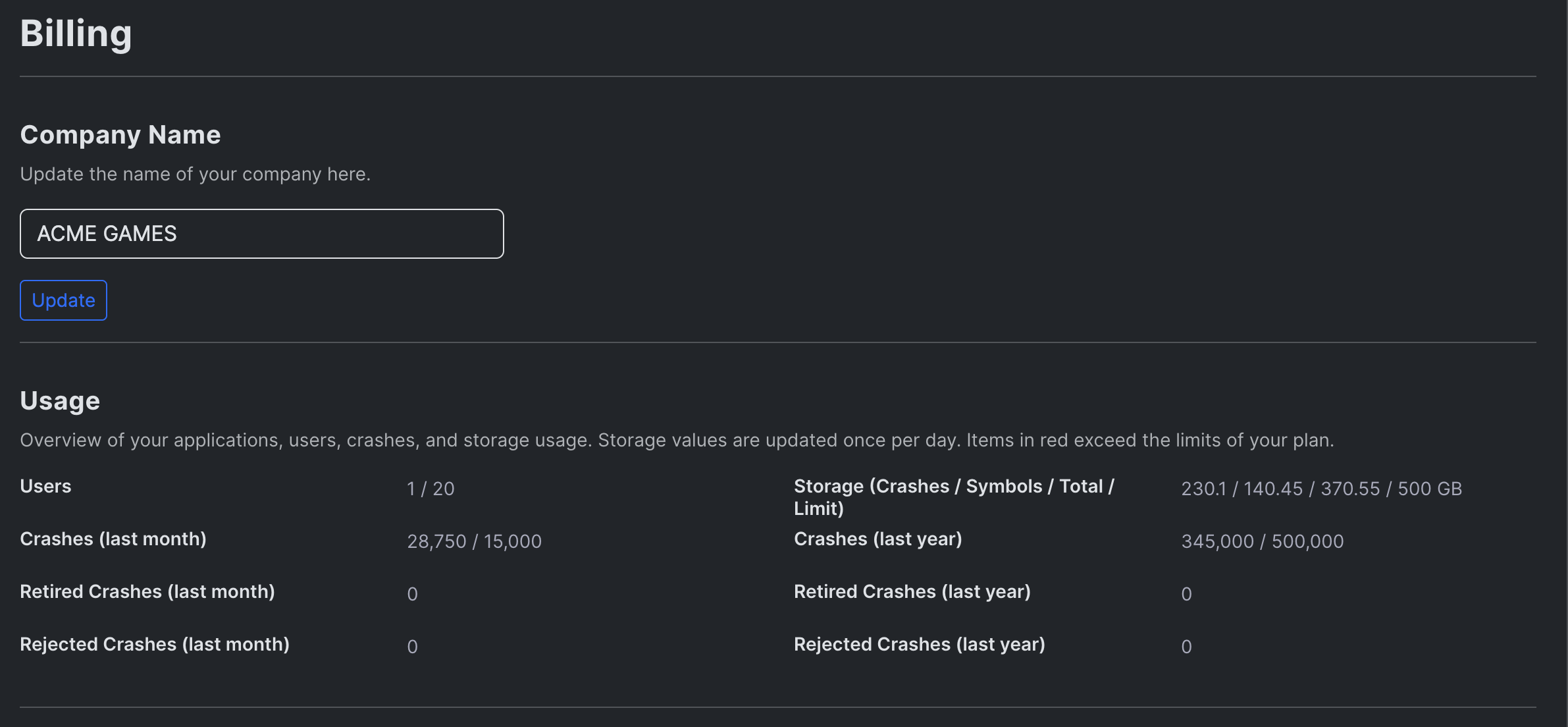 Understanding your account usage is essential for optimizing your BugSplat plan and ensuring smooth crash reporting. BugSplat provides detailed insights into your usage through the Billing Page and the Usage Page.
